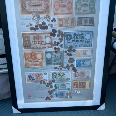 Samling av ulike norske mynter 5 kroninger, 1 kroninger og 10 kroninger