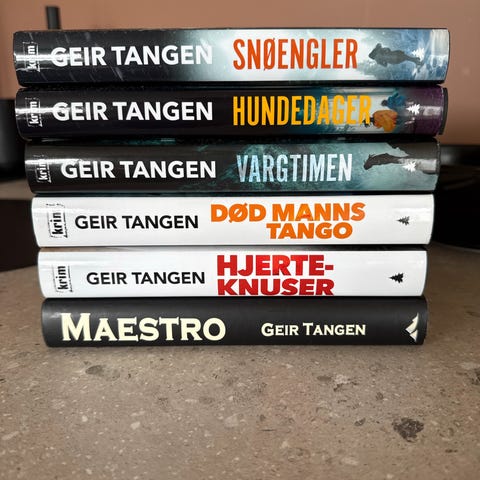 Selger to krim bøker av Geir Tangen. Begge er signerte. Maestro er nummer 1 og Død manns tango er nummer 3 i serien om journalist Viljar Ravn Gudmundsson og politietterforsker Lotte Skeisvoll.