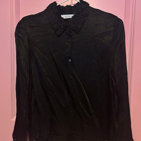 Reserved bluse i størrelse 36, hvit farge. Laget av lett materiale med langermet design og rund hals med snøring foran. Passer til hverdagsbruk. Aldri brukt.
