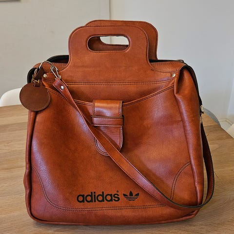 Adidas retrobag laget av stoffmateriale. Baggen har en hovedlomme med glidelås, bærehåndtak og justerbar skulderrem. Passer for turer /reiser, lengde 57 cm og 37 cm bredde