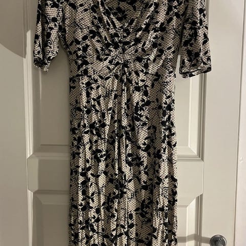 Svart, ermeløs, kjole med hvit røde og grønn/blå prikker. Knappepynt på brystet og rysjer/ruffles rundt halsen. Knytebånd i livet. Glidelås i siden. Foret. 100% viskose (for i acetat).