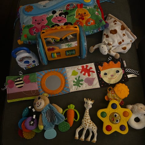 Babyleker til en verdi av ca 1100kr. Noen er mere slitt enn andre, men pent brukte ting. Mye av slitasjen skyldes jevnlig vasking. Dyr-, og røykefri familie. Mummi, Fisher-Price, Moulin Roty, Lazaro osv.