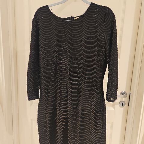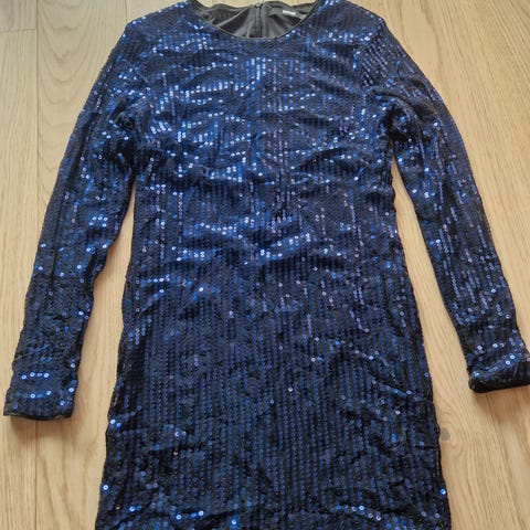 Helt ny og aldri brukt Bik Bok paljettkjole i blå farge, størrelse XS. Kjolen har lange ermer og er dekorert med blå paljetter. Materialet gir et glitrende utseende, egnet for festlige anledninger. Med glidelås på ryggen.