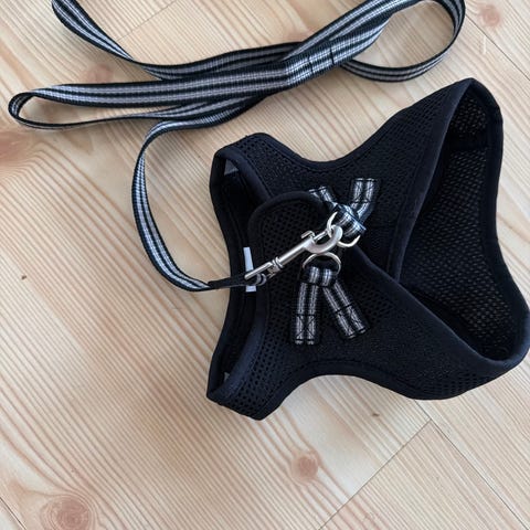 Hundesele med kobbel i rutemønster, svart og hvit farge, liten størrelse. Laget med mykt materiale for komfort, egnet for små hunder. Kobbelet har metallkrok for feste.