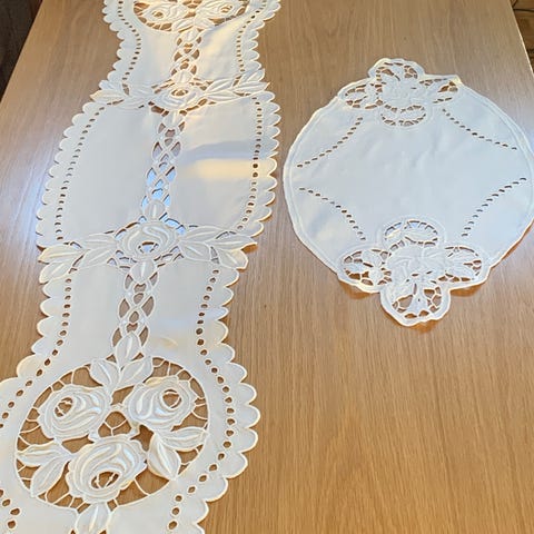Selger forskjellige duker, håndbroderte hardangersøm. Gul løper og putetrekk frå Kremmerhuset, duk frå Green Gate, eldre pyntehåndkle med motiv frå sjøen.