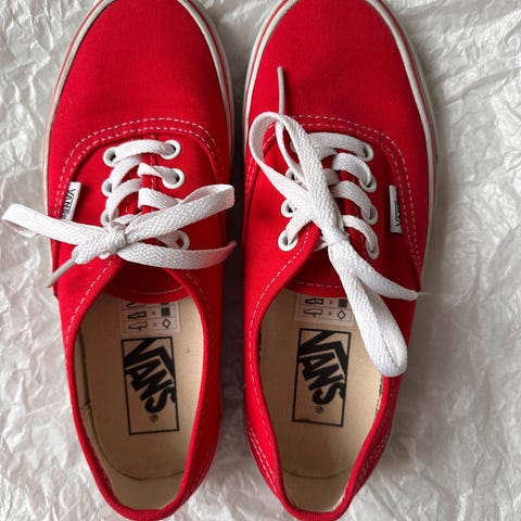 Vans Authentic sneakers i rød farge, laget av stoffmateriale. Skoene er i størrelse 36 og designet for damer. Modellen har klassisk lav profil med hvite detaljer og gummisåle.