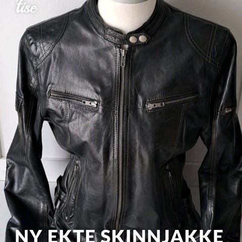 En sort kort jakke i MC fasong i kunstlær med fuskepels på kragen og inne i jakken. Litt stiv i kunstlæret, da det er lenge siden den er brukt.