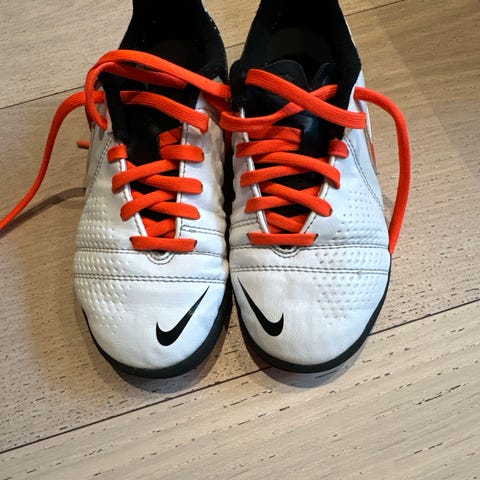 Nike Phantom GT2 fotballsko i størrelse 30 for barn. Skoene er hvite med oransje lisser og har svart Nike-logo. Designet for fotballspill med fokus på kontroll og presisjon. Materialet er syntetisk og skoene har en lav profil.