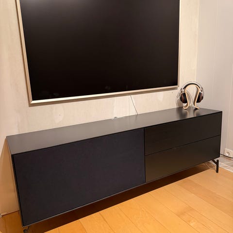 Selger en TV-benk fra Bolia (Case-serien). Materiale eik. Frontene er i svart stoff og sokkel i svartlakkert stål. Det er noen bruksmerker (se bilder), men ellers i god stand.