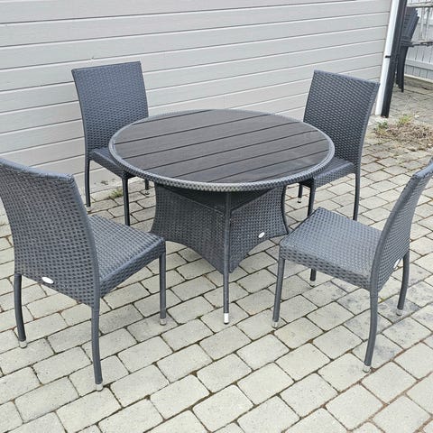 Det værbestandige flettverket i polyrotting er både UV-bestandig og enkelt å rengjøre, og understellet i pulverlakkert stål sikrer lang levetid. Dette gjør bordet ideelt til utendørs bruk, året rundt.