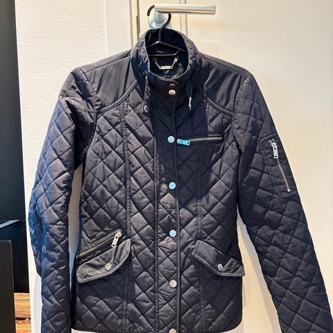 Veldig pen høstjakke i svart farge med flere lommer og glidelås foran selges. Str. S