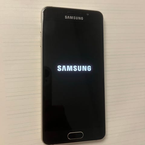 Sort Samsung Galaxy A3 mobiltelefon. Selv om det er noen mindre sprekker i skjermen, så fungerer telefonen helt fint. Beskyttelsesglasset, som alltid har vært på telefonen, har sørget for at sprekkene hverken er særlig synlige eller at de har utviklet seg videre.