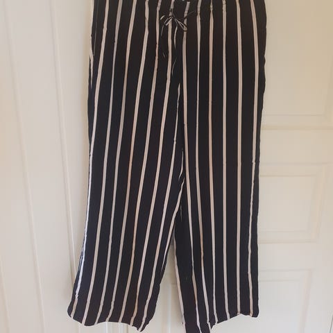 Bukse fra H&M i svart med struktur. Flared modell med høyt liv og strikk på toppen.
