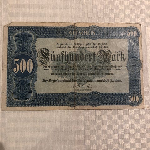 Reichsbank 500 Mark sedler utstedt i Tyskland i 1923. Papirpenger med historisk verdi, trykket med tysk tekst og offisielle stempler. Brukt som valuta i Weimarrepublikken under hyperinflasjonen.