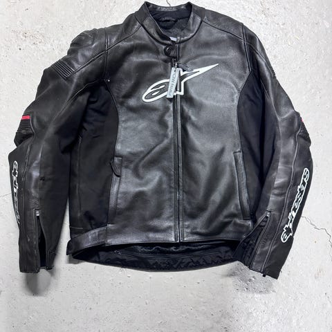 Kul fôret kjøredress i skinn til motorsykkelkjøring. Størrelse 42, men noe liten i størrelse. Den kan deles i to med glidelås. Beskyttelsesskinne i rygg. Hel og pen dress.