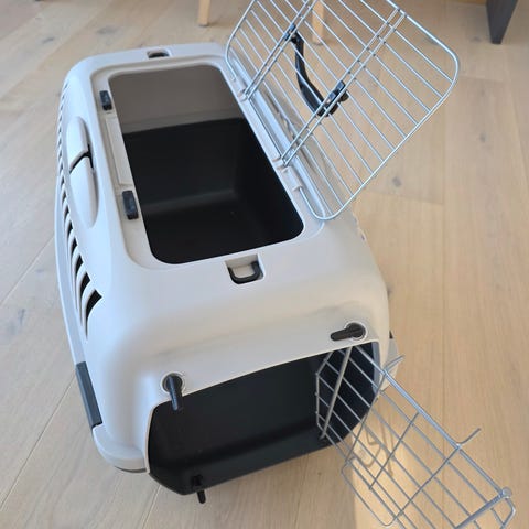 Atlas 10 dyretransportbur laget av plast i grønn og hvit farge. Buret har håndtak for enkel bæring og metallgitter foran som dør. Egnet for transport av små til mellomstore kjæledyr.