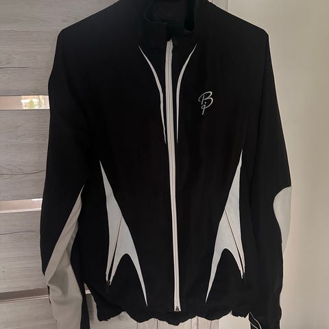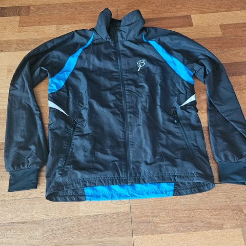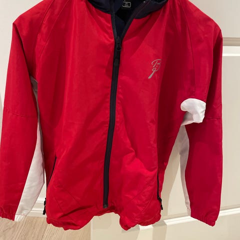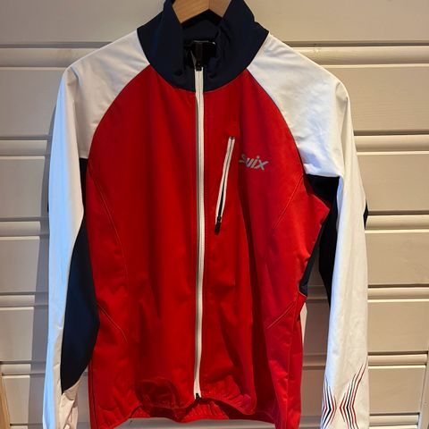 Bjørn Dæhlie unisex jakke i størrelse M med flerfarget design i rødt, hvitt og blått. Jakken har glidelås foran og to lommer med glidelås. Materialet er ikke spesifisert, men jakken er egnet for utendørs bruk.