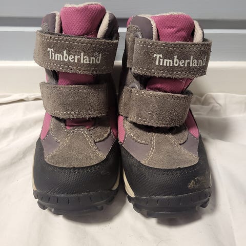Timberland vinterstøvler for barn i størrelse 24. Støvlene er svarte og har en slitesterk yttersåle med godt grep. De har borrelåslukking for enkel påkledning og er designet for å gi varme og beskyttelse i kalde og våte forhold. Passer for både gutter og jenter. Borrelåsen må renses og skoene trenger en liten overflatevask. Litt slitasje på tuppen av skoene, men de har masse bruk igjen.