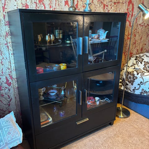 Meget pent brukt seksjon med vitrineskap med barskap gis bort til førstemann som kommer og henter. Seksjonen framstår som ny.