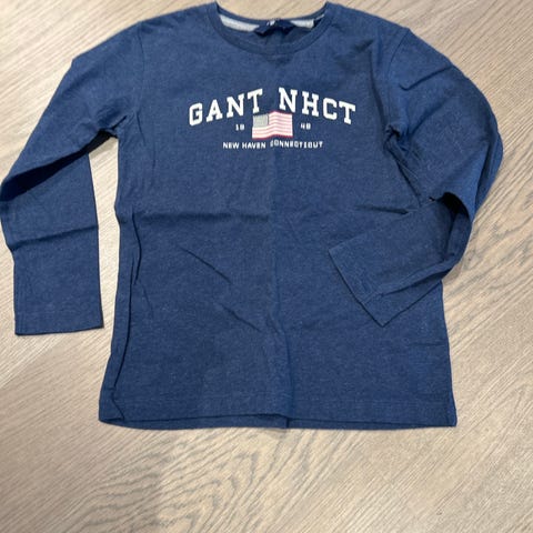 Opprinnelig en Gant-genser i str. XL (dame/herre), men den krympet i vask og passer nå mye mindre. Jeg tror den tilsvarer ca. barnestørrelse 128–134, men er litt usikker. Genseren er i 100 % ull og har klassisk Gant-logo foran.