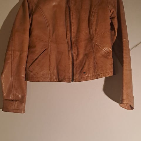 Mykt nappaskinn, toveis glidelås på skrå foran, stikklommer i sidene. Lite brukt.