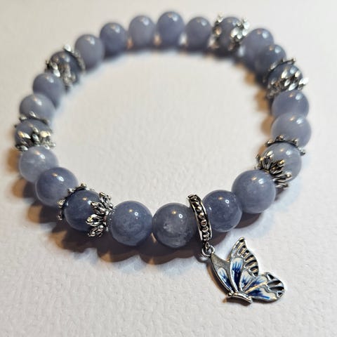 Håndlaget Armbånd med Lilla perler, og dekor i sølv, Påfugl anheng og 2 ringer med blanke stener.