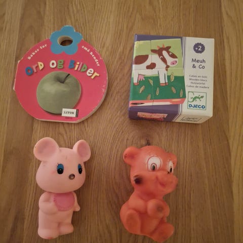 Barnas Div-leker selges for 30 kr per stykk i god stand. Kun ABC-treklosser selges for 50 kr.