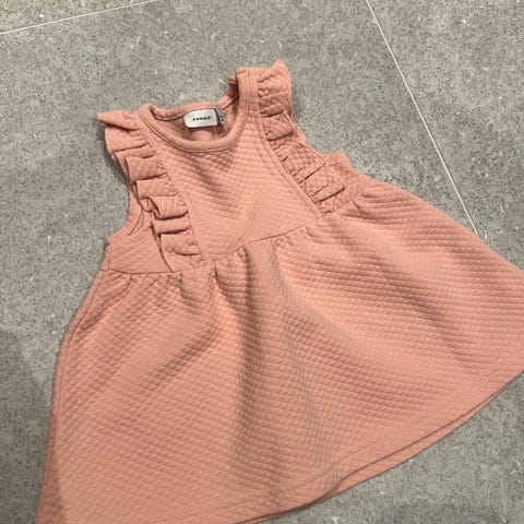 H&M kjole i størrelse 62 for jente. Kjolen er brun med dekorative blomsterdetaljer på brystet. Den har knapper på baksiden og en volangkant med blonder nederst. Laget av et mykt materiale egnet for barn.