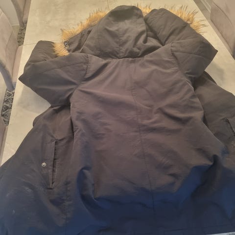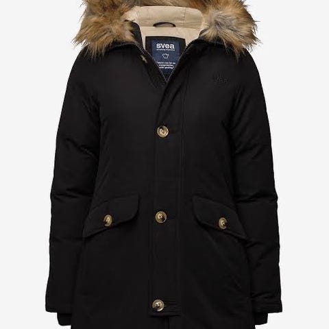 Svea Vinterjakke i størrelse XS for kvinner. Jakken er svart og designet for vinterbruk med isolasjon for kaldt vær. Den har hette med fuskepelskant og flere lommer. Materialet er tilpasset for å gi varme og beskyttelse mot vær og vind.