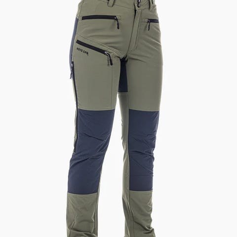 Move On skallbukse i grå grønn farge, størrelse M. Buksen har glidelåslommer foran, i siden på bena og justerbart belte i livet. Materialet er vannavstøtende og egnet for utendørs bruk.