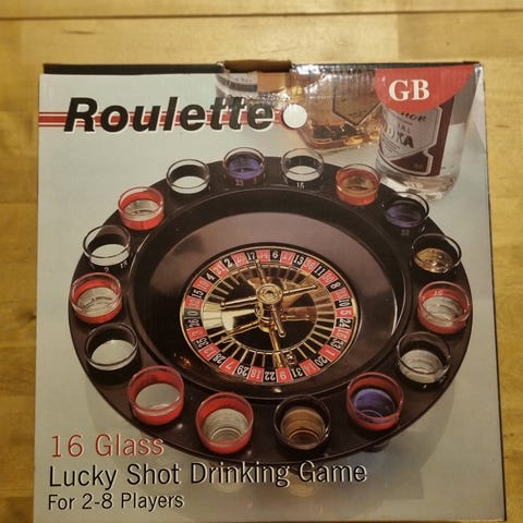 Drinking Roulette Set er et spillbrett med innebygd rulett og plass til glass. Settet inkluderer en rulettskive i midten og 16 glassplasser rundt kanten. Brettet og rulettskiven er laget av plastmateriale i svart farge. Designet for sosialt samvær og spill som kombinerer rulett med drikking.