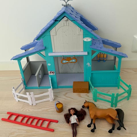 Liten fin stall med hest, innhegning, fotplass, høi og bøtte m børste for stell!