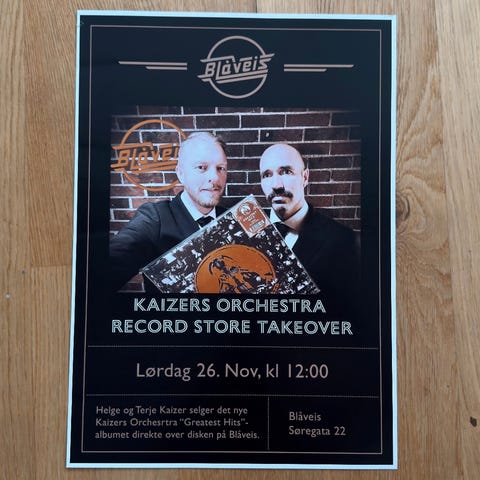 Siden jeg i 2013 brukte alle pengene jeg eide på Kaizers-konserter og merch, var det ingen cash igjen til førerkort å bil. Plakaten er derfor fraktet møysommelig gjennom regn, vind og promille hjem før den ble rammet inn dagen derpå. Jeg har tatt bilde av de merkene jeg kan se. Rammen kan medfølge om ønskelig.