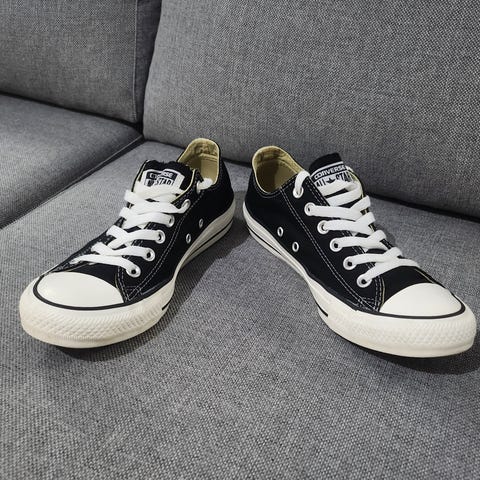 Pent brukte sko fra Converse. Kan også sende med nye hæl beskyttende puter som man kan feste bak i hælen for å plastre over der det er rift. Selges billig pga plassmangel.