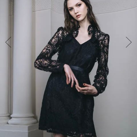 Ida Sjöstedt svart kjole i størrelse S for kvinner. Kjolen har et mønster med små blomster og er laget av et lett materiale. Den har en tettsittende overdel med v-hals og volanger på skjørtet, samt ermet med rysjer.