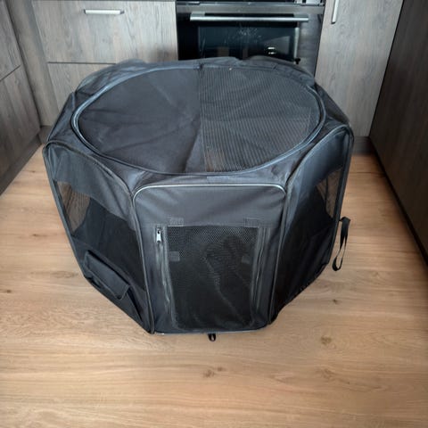 Stort transportbur i stoff, L60 x B45 x H45 cm. Buret er sammenleggbart, og tar liten plass når du ikke bruker det. Buret kan festes utendørs med plugger. Mykdt underlag i fleece materiale, som er behagelig for kjæledyret ditt. Buret kan åpnes/lukkes med glidelås på toppen og på 2 sider. Netting i sidene sikrer utsyn og god luftsirkulasjon. Utstyrt med 2 praktiske sidelommer.