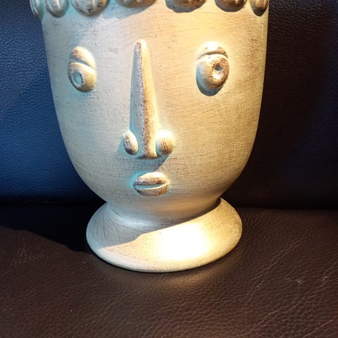 Plantasjen Didirik blomsterpotte laget av keramisk materiale i beige farge. Potten har et unikt ansiktsdesign med dekorative detaljer på sidene. Egnet for innendørs bruk til planter og dekorasjon.