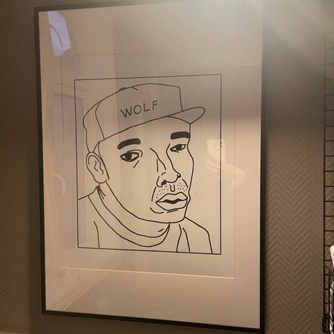 Et skilt til å henge opp eller sette inntil noe. «Sjokolade kommer fra coca som er et tre. Det er en plante. Sjokolade er salat.»