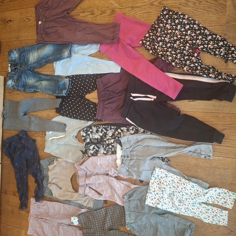 Klespakke: en overtrekksbukse med forsterket rumpe og knær, én kordfløyelsbukse, en bommulsbukse, en genser og en strømpebukse 62% ull. Se bildene for nærmere beskrivelse. Str.122/128