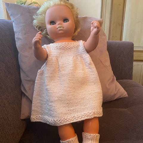Dukke med en høyde på cirka 45 cm, iført klær inkludert en gul og grønn kjole samt en blå genser med hvite detaljer og knapper på skulderen. Dukken har lyshud og kort blondt hår. Klærne er laget av garn og passer til dukken.