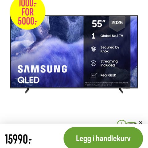 Samsung TV 55 Qled ,Q7f.Flatt skjermpanel med tynn ramme, stativ i metall. Passer for stue eller rom med god plass. Tilkoblingsmuligheter på baksiden for eksterne enheter.
