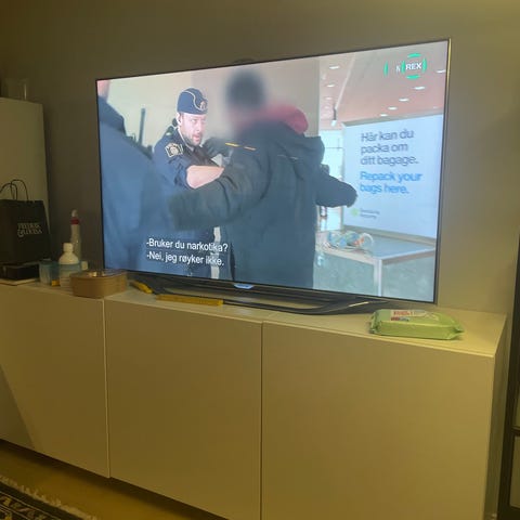 Samsung TV 55 Qled ,Q7f.Flatt skjermpanel med tynn ramme, stativ i metall. Passer for stue eller rom med god plass. Tilkoblingsmuligheter på baksiden for eksterne enheter.
