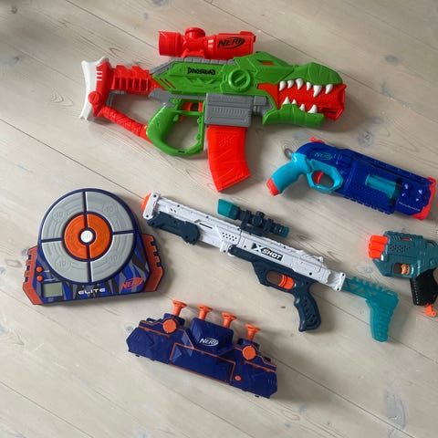 Noen vanngevær/ vannpistoler, en batmobil, ringspill og et par andre pistoler.