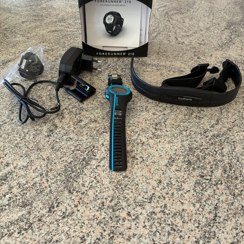 - 1 stk Garmin Forerunner 210 hvor gummien er i oppløsning, og derfor mangler rem. Klokken virker, tar ladning, men mangler lysknapp. USB ladekabel følger med.