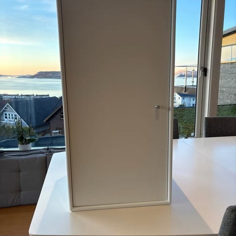 Dør kan eventuelt kjøpes nytt, dette må undersøkes av kjøper, men det går fint å bruke det uten dør. Oppheng følger med, men ikke skruer.