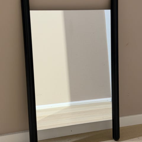 Fint brukt speil i eik med knagger og hylle på bakside i modellen push mirror fra Skagerak. Mål: Høyde 190 cm. Bredde 52 cm. Dybde nederst (ved platen) 46 cm. Dybde øverst 25 cm.