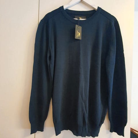 Så og si ubrukt Moods of Norway vintergenser i størrelse M, i ull og bomull. Genseren er grå med røde og hvite detaljer på krage og mansjetter.