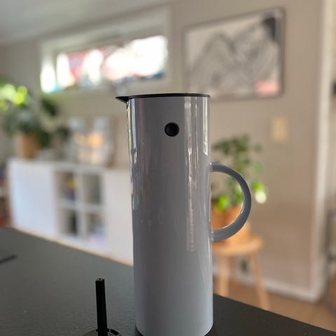 Kaffekannen har litt bruksmerker utvendig men er veldig blank og pen innvendig.