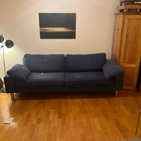 3-seters sofa, heltre ramme, dreide ben med messinghjul foran og messingkopper til å sette hjulene på. 200 cm bred Avtakbare beskyttelsestrekk på armlener.