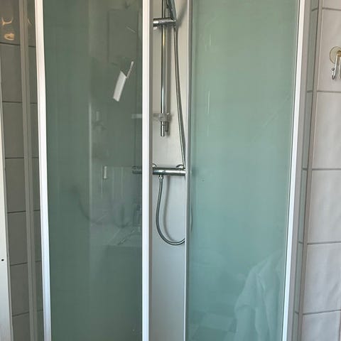 Dusjkabinett med glassdører og hvit bunnplate